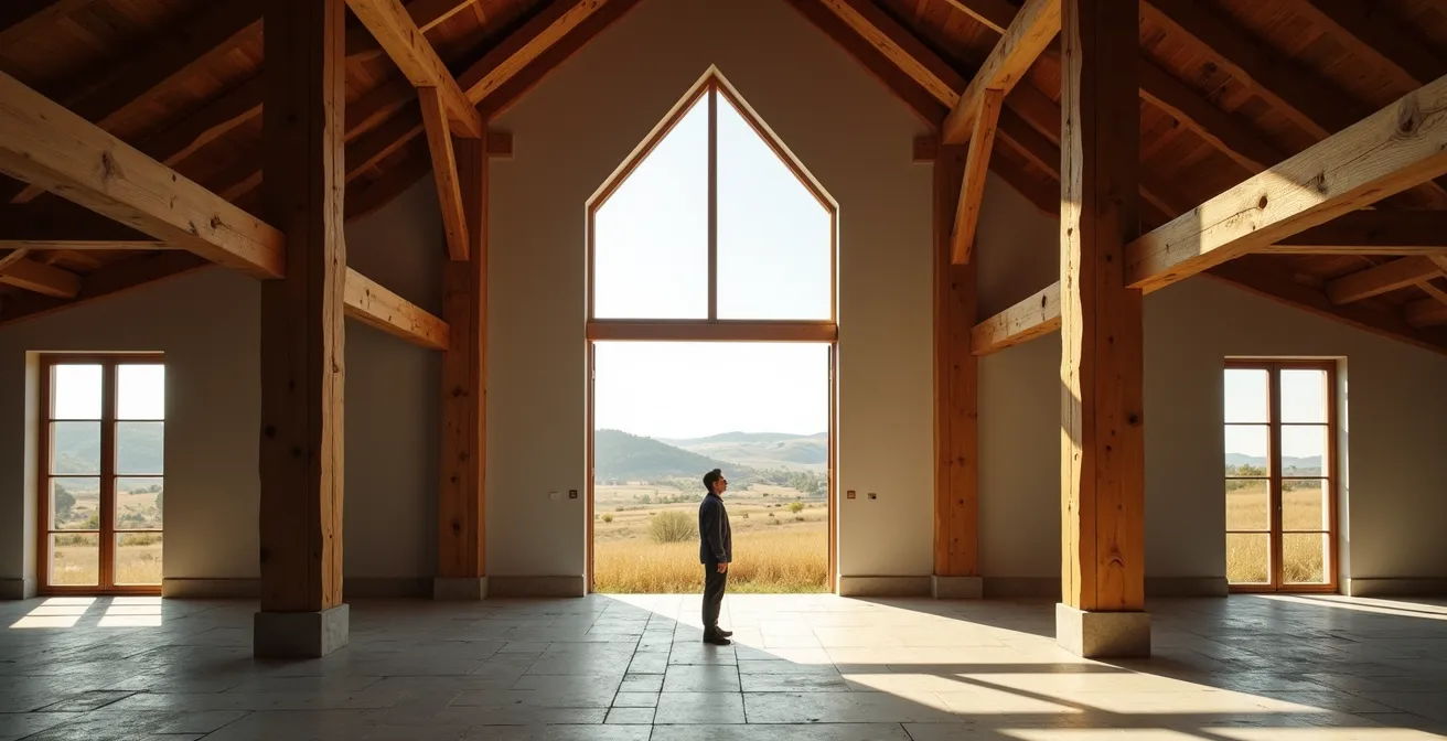 Le premier choc sensoriel en entrant dans une grange rénovée est souvent vertical. L’œil, habitué aux 2,50 mètres réglementaires des appartements urbains, se perd dans une hauteur vertigineuse. Ce n’est pas qu’une impression ; c’est un mécanisme psychologique puissant que j’appelle la décompression volumétrique. Les espaces à grande hauteur sous plafond sont connus pour stimuler la pensée abstraite et la créativité. Votre cerveau, littéralement, se sent moins à l’étroit et s’autorise à « penser plus large ». C’est une libération mentale directement induite par l’architecture.